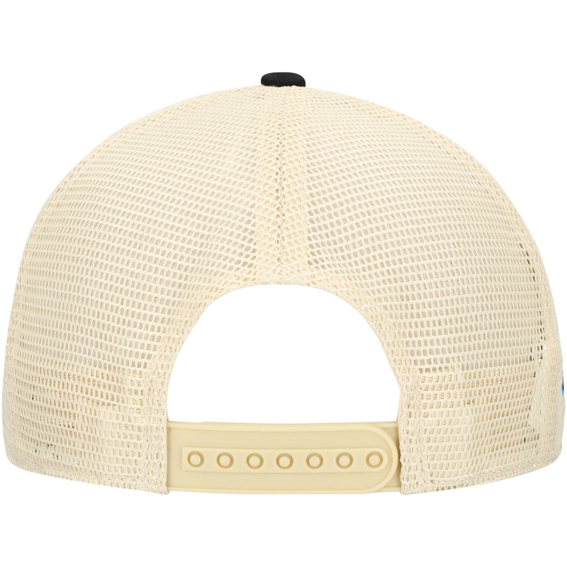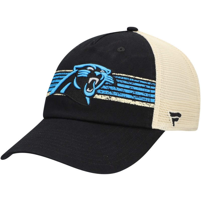 - Distressed striped screen printed across the crown