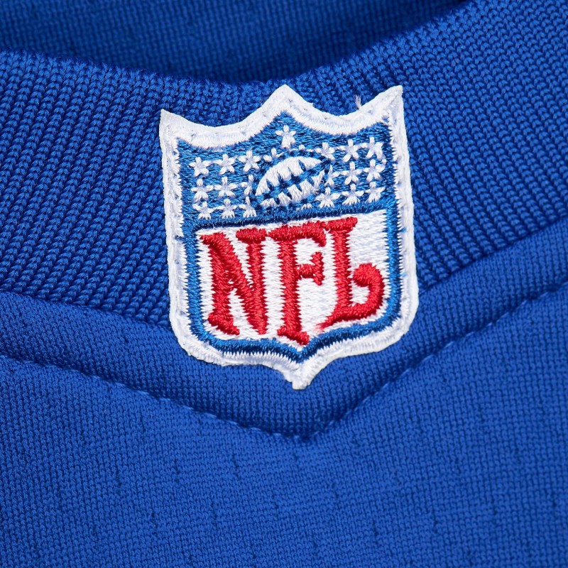 - Sewn-on NFL shield patch with embroidered details at V-neck