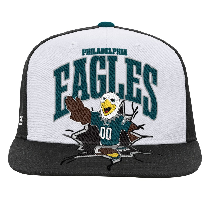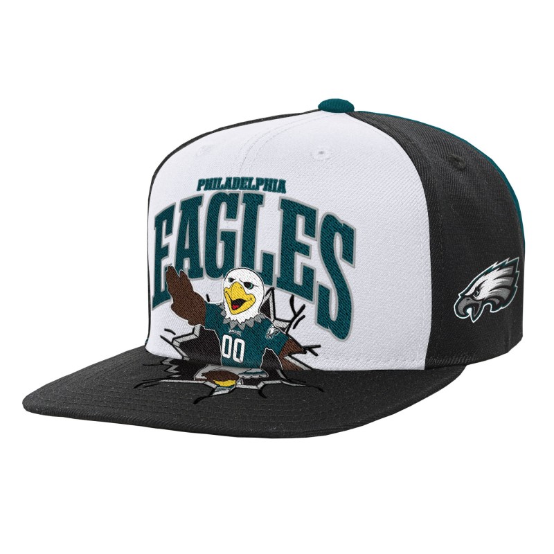 - Embroidered mascot graphic on the front crown and visor