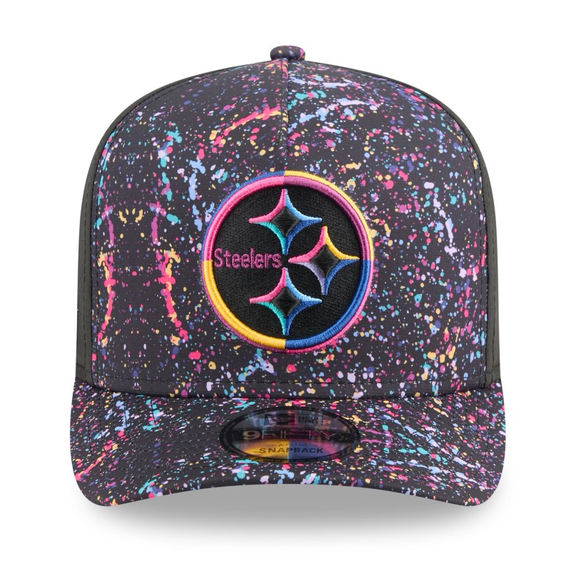 - Multicolor paint splatter pattern sublimated across front panels