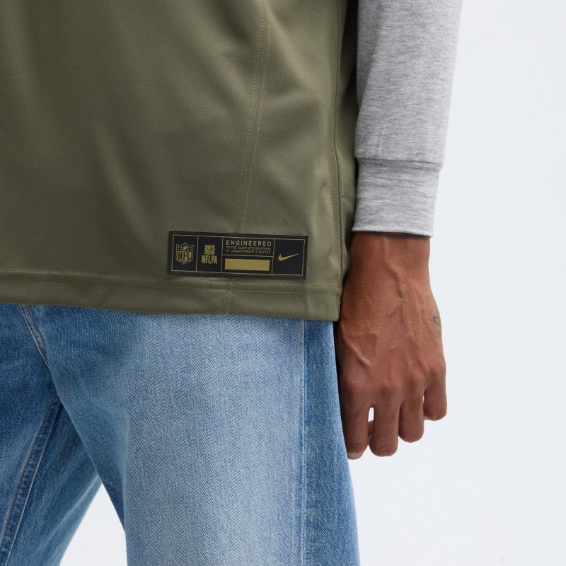 - Chainmaille mesh grill and stitched metallic-effect NFL Shield at neck
