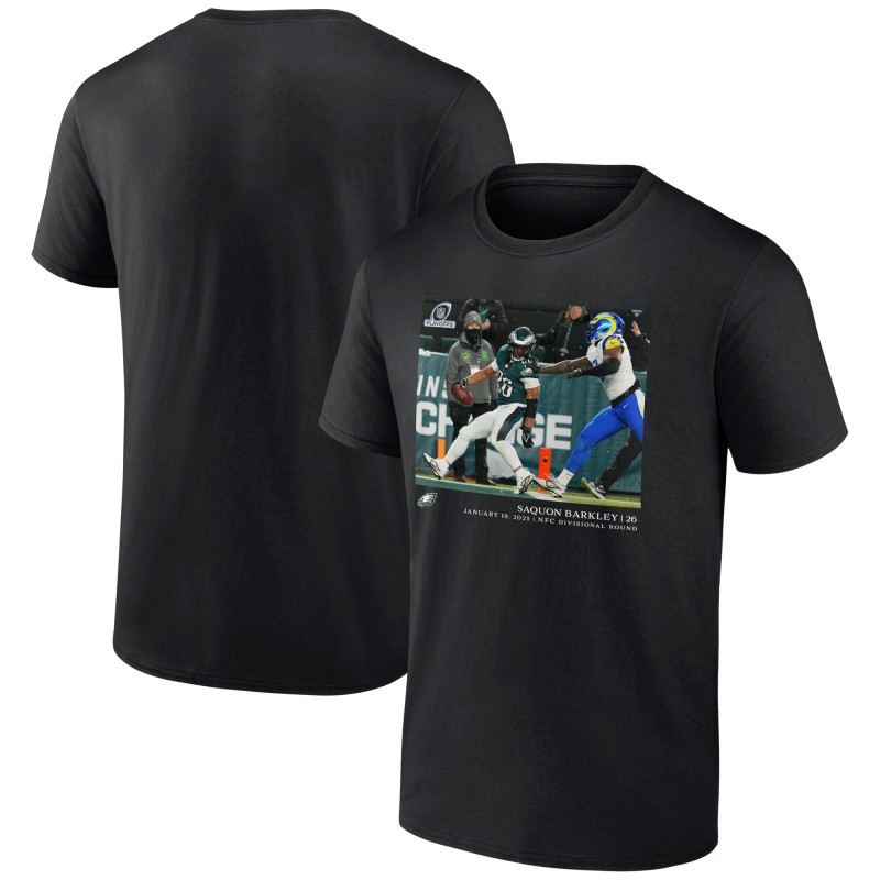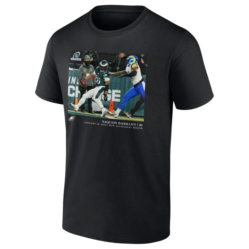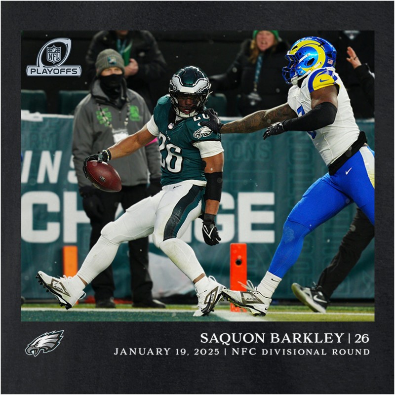 - Philadelphia Eagles running back Saquon Barkley (26) outruns Los Angeles Rams linebacker Jared Verse (8) to score a touchdown during the NFC divisional playoff game, Jan. 19, 2025.